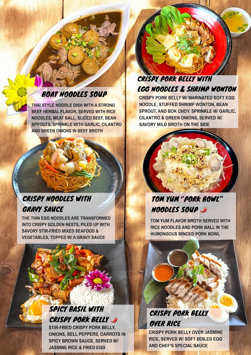 Crispy Pork Belly with marinated soft egg noodle, stuffed shrimp wonton, bean sprout, and bok choy. Sprinkle with garlic, cilantro and green onions. Served with savory mild broth on the side.