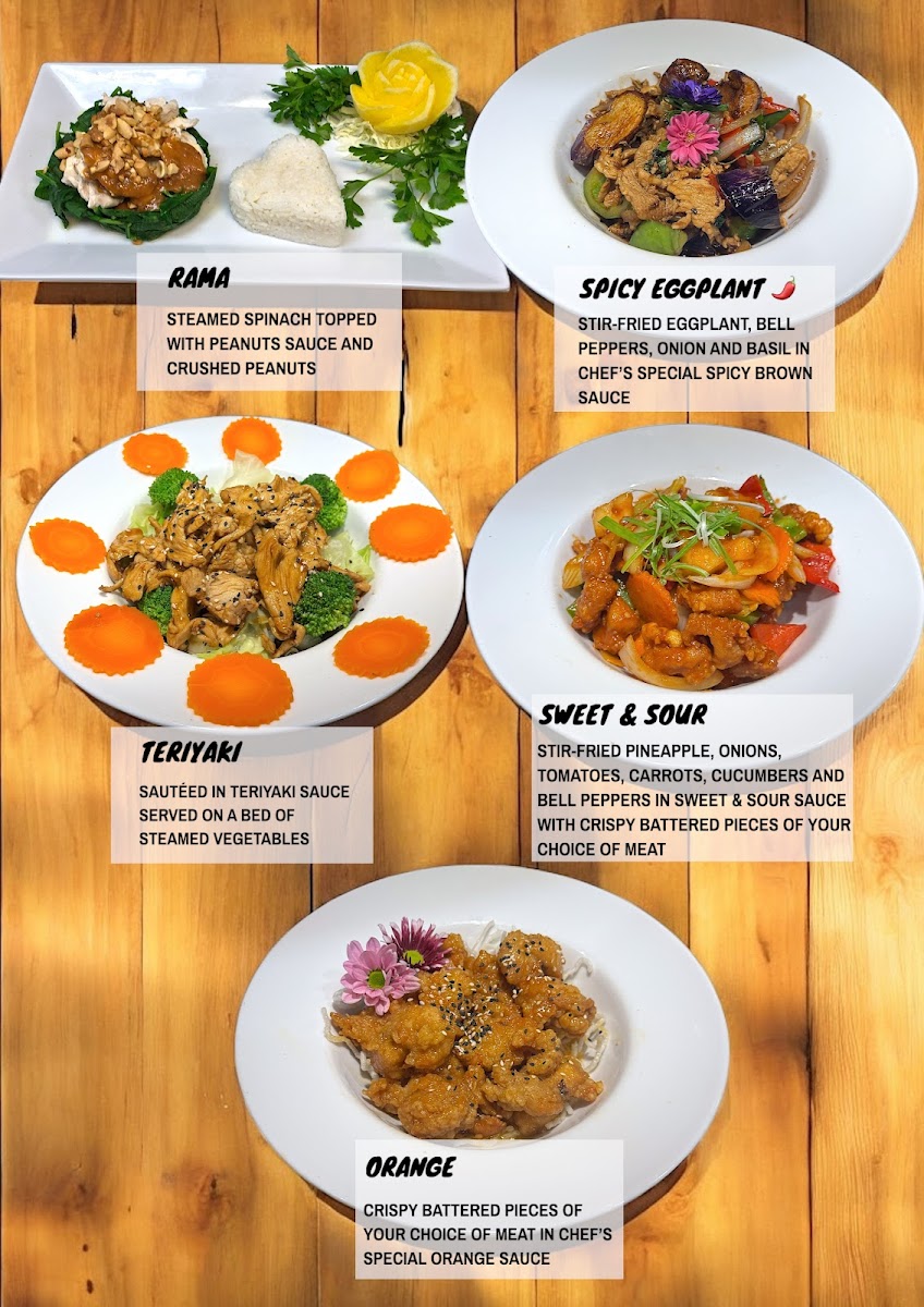 Crispy battered pieces of your choice of protein in chef's special orange sauce.