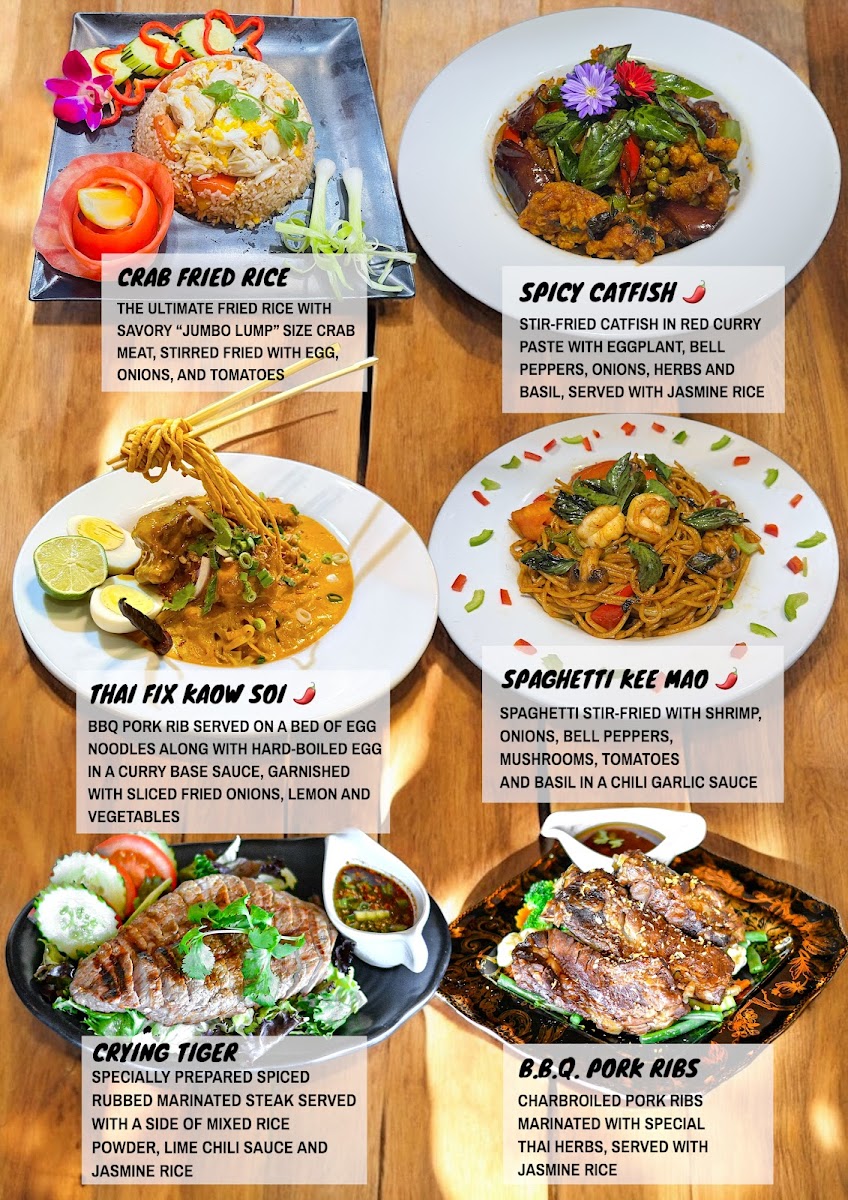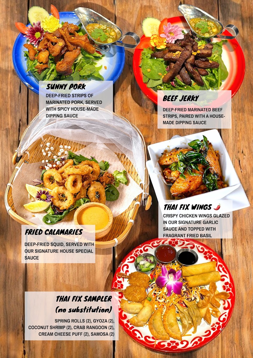 The menu at Thai Fix offers a delightful array of traditional Thai dishes that are sure to please any palate. For lunch, you can indulge in the Mango with Sweet Sticky Rice for dessert. Start your meal with appetizers like Chicken Pops!, Thai Fix Fries, Coconut Shrimp (6), or Crab Rangoon (6). The soup options are perfect for those craving something warm, with choices like Wonton Soup (24 oz), Chicken Tom Yum (24 oz), and the rich Chicken Tom Kha (24 oz). Salads such as House Salad, Larb, and Papaya Salad offer a refreshing contrast to the heartier dishes. For a comforting meal, try one of their curries, including California Curry, Ruby Curry, or Mussamun Curry. The fried rice options, like House Fried Rice and Pineapple Fried Rice, are crowd favorites, while the noodle selection, including Pad Thai and Hangover Noodle, provides satisfying flavors. If you're looking for something special, their Chef's Specials like Crying Tiger and BBQ Pork Ribs offer a unique twist on classic Thai dishes. For crispy pork belly lovers, options such as Spicy Basil with Crispy Pork Belly and Crispy Pork Belly over Rice are a must-try. Side dishes like Jasmine Rice and Sticky Rice perfectly complement any meal. For dessert, Thai Tea Cheesecake Lava is a delicious indulgence, while beverages like Thai Iced Tea (24 oz) and Milky Matcha provide a refreshing sip. With a great selection of sake, beer, and house wines, Thai Fix is a perfect spot to enjoy flavorful Thai cuisine in Huntington Beach.