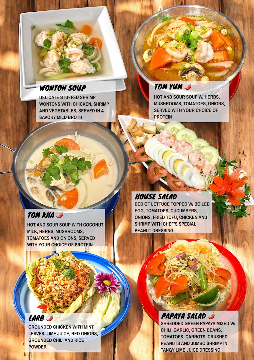 Shredded green papaya mixed with chili, garlic, green beans, tomatoes, carrots, crushed peanuts and JUMBO shrimp in lime juice dressing. ????️