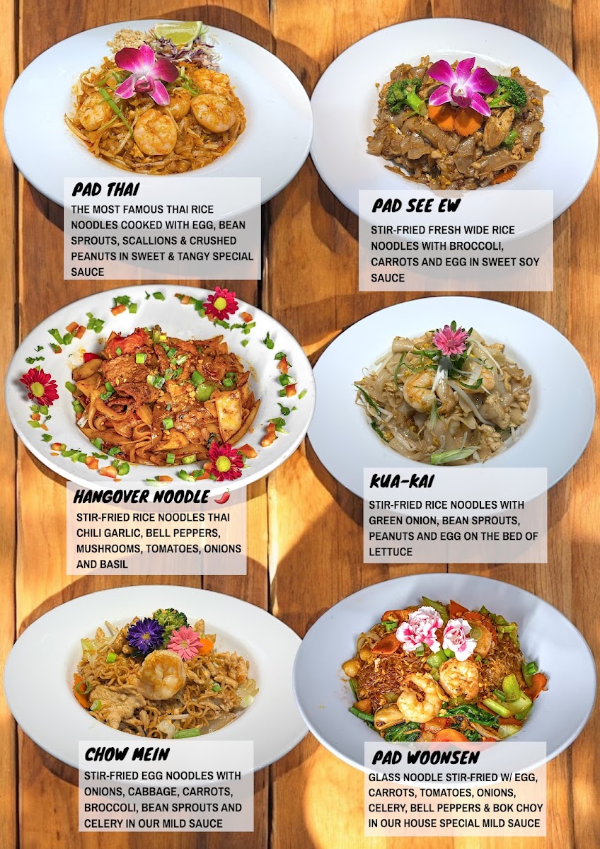 Most famous Thai rice noodles cooked with egg, bean sprouts, scallions and crushed peanuts in sweet and tangy special sauce.