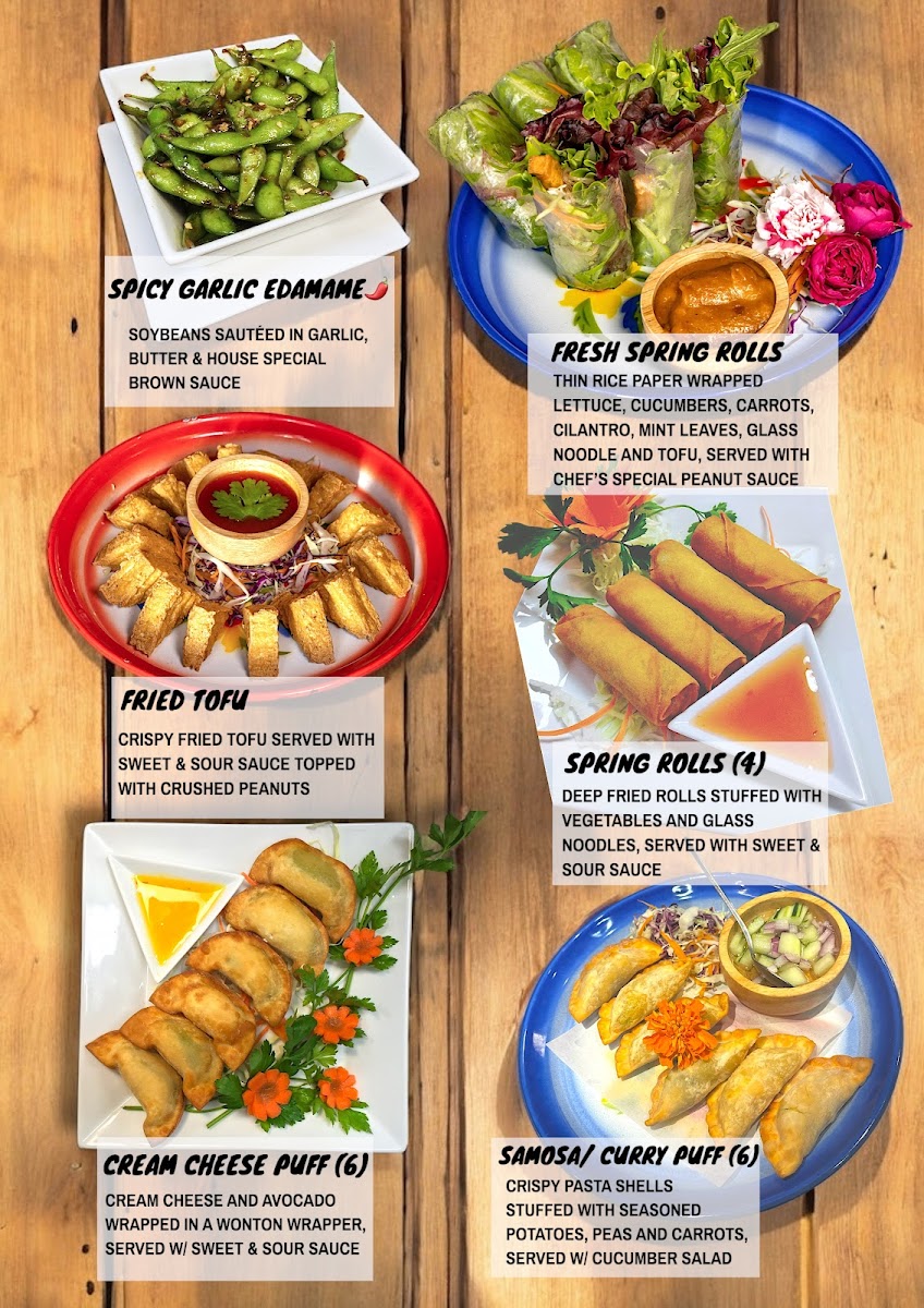 Thin rice paper wrapped lettuce, cucumber, carrot, cilantro, mint leaves, glass noodle and tofu, served with chef’s special peanut sauce.